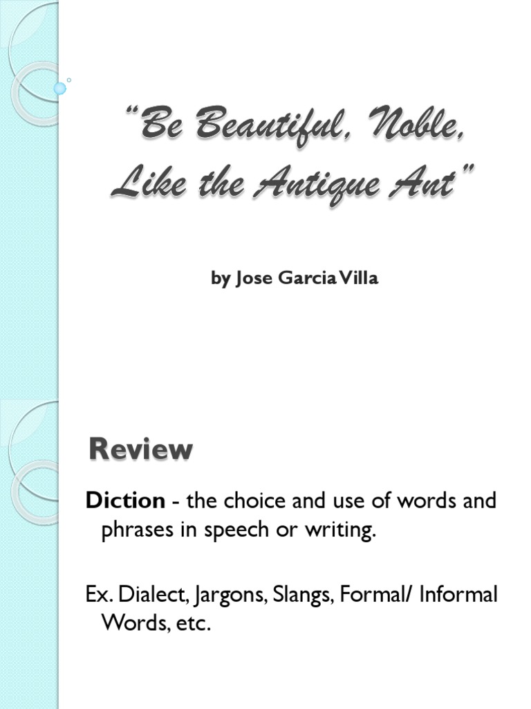 Be beautiful noble like the antique ant 1908 1997 by jose garcia villa be beautiful noble like the antique ant who bore the storms as he bore the. Be beautiful noble like the antique ant. Wore only his flesh.