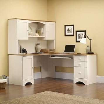A corner computer desk with a hutch on top made out of solid wood with a coat of white paint and a shiny polished top surface. Product title monarch desk 36l antique white traditional average rating. Product title bush furniture cabot 60w corner desk with hutch average rating.
