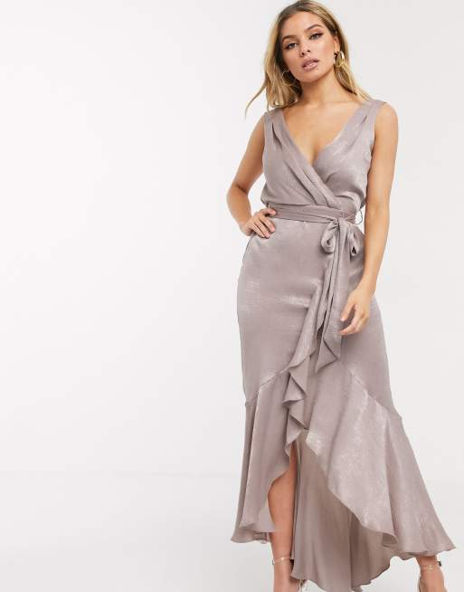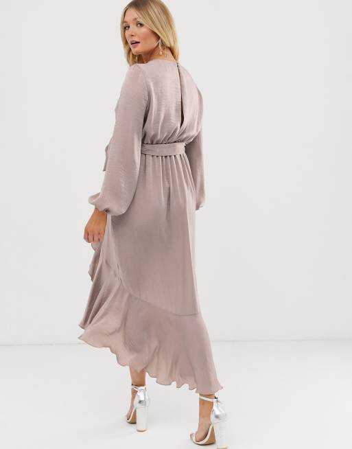 Flounce London Satin Wrap Front Midaxi Dress In Antique Asos
