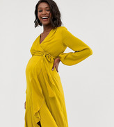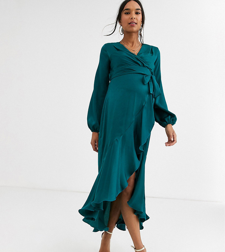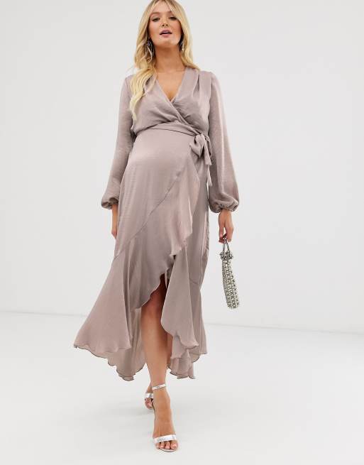 Flounce London Maternity Satin Wrap Front Midi Dress In Antique Asos