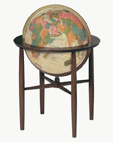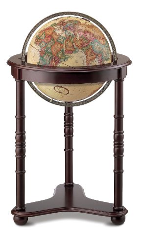 The lafayette 16 inch antique ocean illuminated floor standing world globe by replogle stands a total of 33 inches tall and features champagne colored oceans that have been beautifully paired with pastel orange red green and blue continents and countries creating a look that is absolutely in a class of it is own.